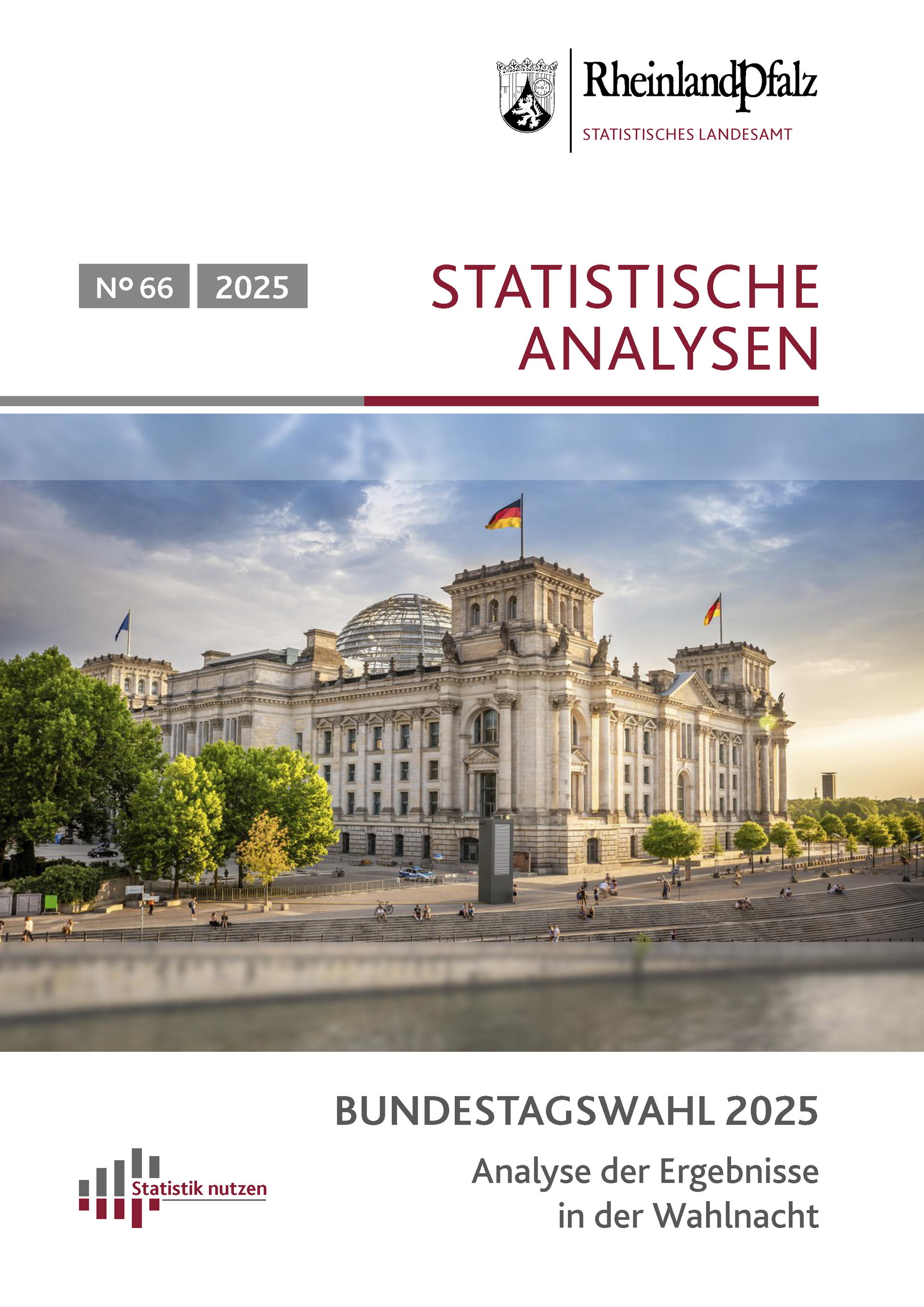 Bereits zum siebten Mal hat das Statistische Landesamt zu einer Bundestagswahl noch in der Wahlnacht eine Analyse der Wahlergebnisse erstellt. Neben einer Darstellung und Kommentierung der wichtigsten Ergebnisse auf der Landes-, der Wahlkreis- und der Kreisebene gibt die Veröffentlichung Auskunft über die Schwerpunktgebiete der Parteien sowie über den Einfluss ausgewählter Merkmale auf das Abstimmungsverhalten der Wählerinnen und Wähler. Die Veröffentlichung „Bundestagswahl 2025 – Analyse der Ergebnisse in der Wahlnacht“ steht zum kostenlosen Download bereit: www.statistik.rlp.de/publikationen/analysen