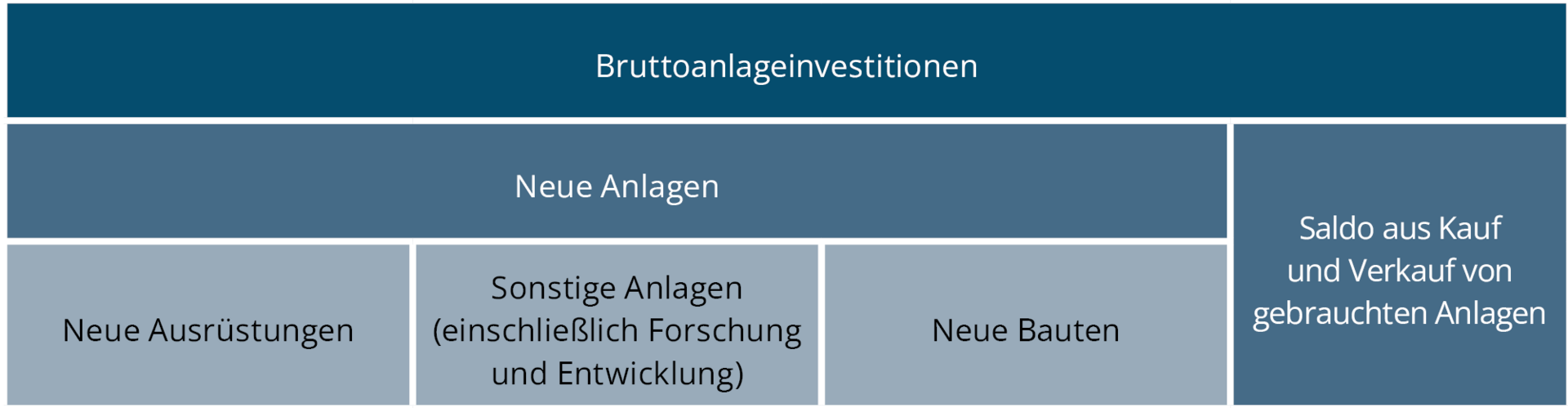 Die Bruttoanlageinvestitionen umfassen den Erwerb von dauerhaften und reproduzierbaren Produktionsmitteln sowie selbst erstellte Anlagen und größere Wert steigernde Reparaturen. Es werden auch gewisse Werterhöhungen an nicht produzierten Vermögensgütern berücksichtigt, insbesondere erhebliche Verbesserungen an Grund und Boden (z. B. Trockenlegung von Marschland). Als dauerhaft gelten diejenigen Produktionsmittel, deren Nutzungsdauer mehr als ein Jahr beträgt. Die Bruttoanlageinvestitionen setzen sich aus dem Erwerb neuer Anlagen und dem Saldo aus Käufen und Verkäufen von gebrauchten Anlagen zusammen. Da ein vollständiger Nachweis der Transaktionen mit gebrauchten Anlagen zwischen den investierenden Wirtschaftsbereichen mangels statistischer Erhebungen nicht möglich ist, können die Anlageinvestitionen nach Wirtschaftsbereichen nur für neue Anlagen dargestellt werden.